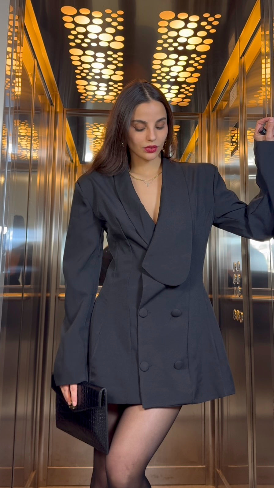 Abito corto strutturato con costruzione tipo blazer. Modello doppiopetto con rever classico e chiusura frontale con bottoni. Spalle definite e maniche lunghe.