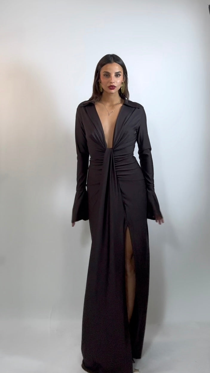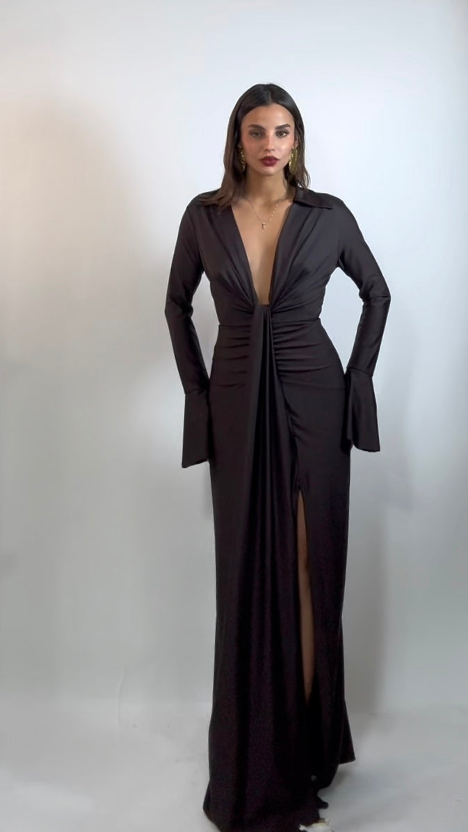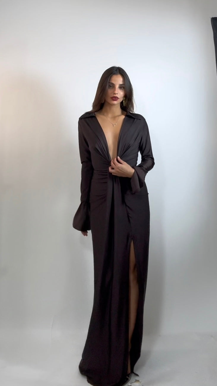 Abito lungo dal taglio sofisticato con scollo profondo a V e colletto camicia. Le maniche lunghe con polsini svasati e il drappeggio centrale sul punto vita slanciano la figura, mentre lo spacco frontale dona movimento e sensualità. La linea fluida e la vestibilità morbida rendono questo modello perfetto per un’eleganza contemporanea e decisa.
