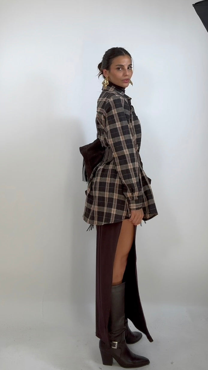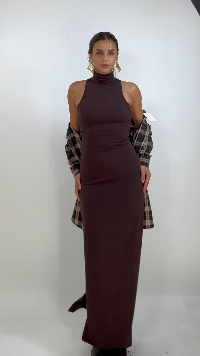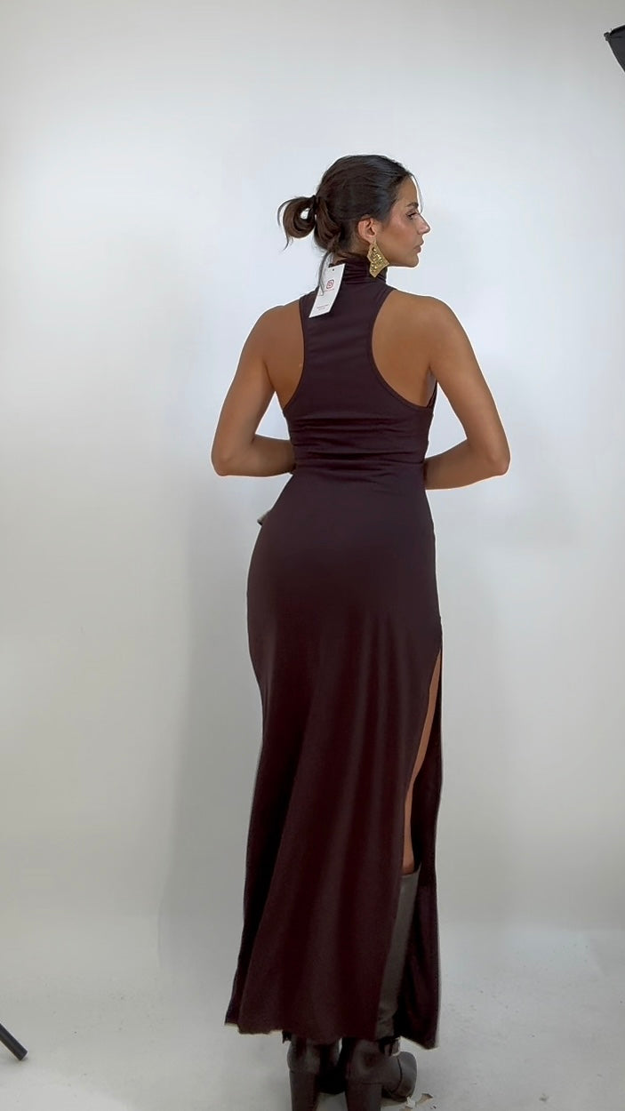 Abito lungo dalla linea aderente con collo alto e taglio vogatore. Realizzato in tessuto fluido che valorizza le forme con eleganza, presenta una silhouette essenziale e raffinata, pensata per slanciare la figura. Lo spacco laterale dona movimento e sensualità, rendendolo un capo perfetto per ogni occasione.