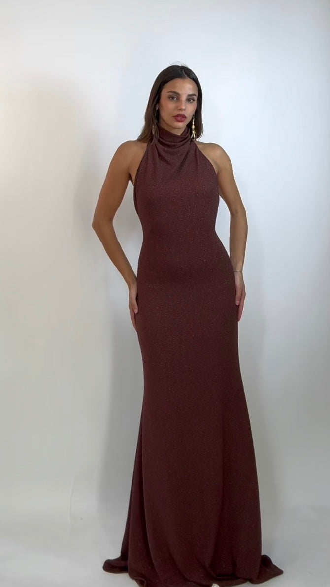 Abito lungo dal design minimal e seducente, caratterizzato da collo alto e schiena completamente scoperta. La linea fasciante esalta le forme con eleganza, mentre il tessuto luminoso dona un raffinato effetto scintillante ad ogni movimento. Un capo che incarna il perfetto equilibrio tra semplicità e glamour, ideale per distinguersi con classe.