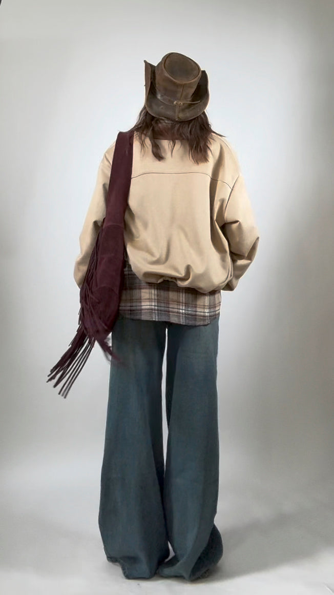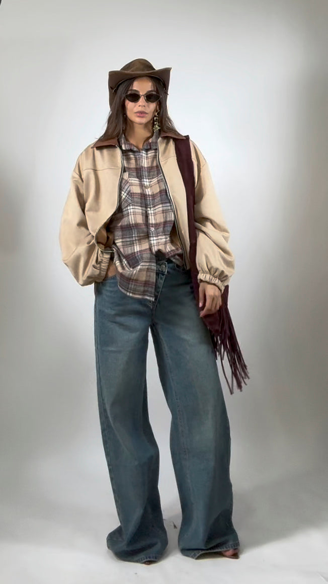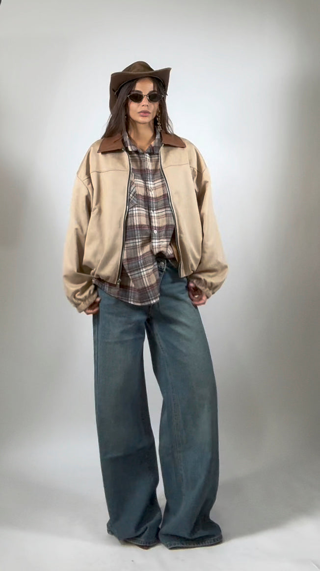 Giacca bomber oversize scamosciato con zip frontale e colletto in simile pelle a contrasto. Modello ampio con spalle scese, maniche voluminose e fondo elasticizzato per una vestibilità confortevole e contemporanea. Un capo casual dal taglio urban, perfetto per dare carattere a look quotidiani e streetwear.