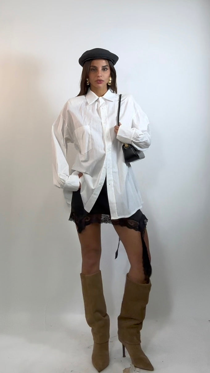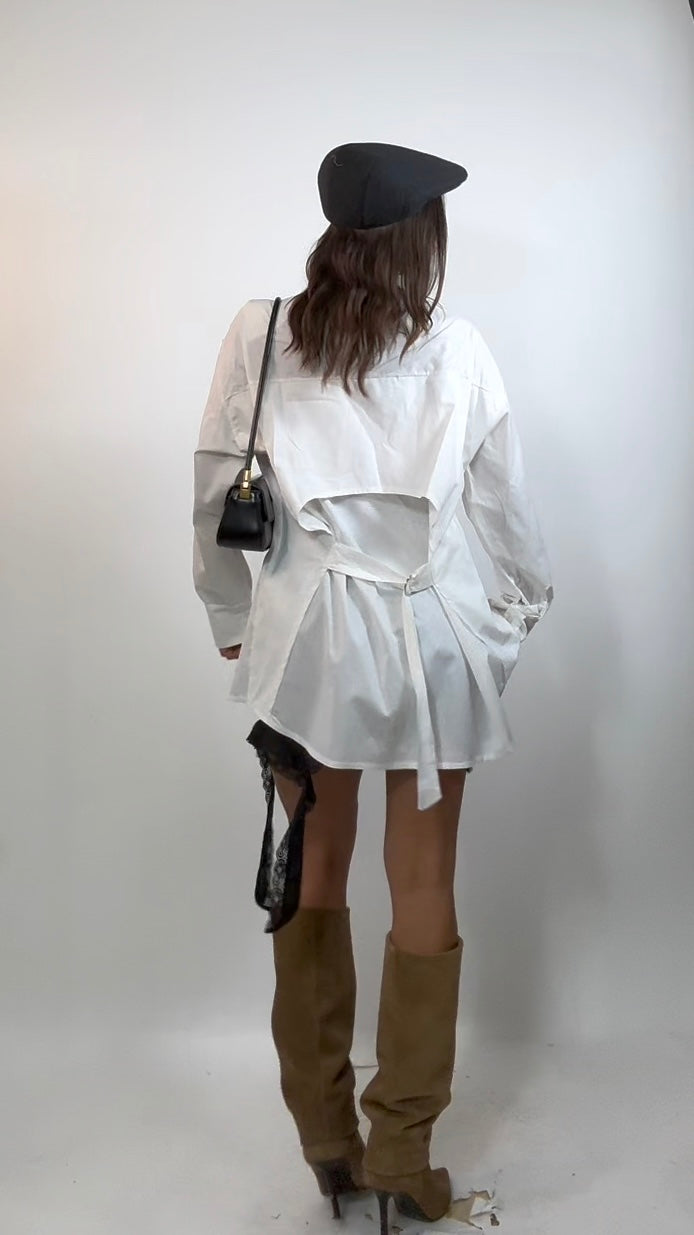 Camicia bianca oversize con spalline imbottite e taglio strutturato. Realizzata con linea dritta e maxi tasche frontali, presenta un originale dettaglio cut-out posteriore con cintura regolabile che scolpisce la silhouette pur mantenendo un fit rilassato. Un capo contemporaneo e versatile, perfetto da interpretare in chiave elegante o street.