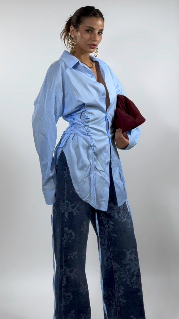 Camicia lunga con colletto classico e chiusura frontale con bottoni. Dettaglio lacci  su entrambi i  lati ;  regolabili che definiscono il punto vita, creando un effetto silhouette sagomata. Linea moderna e sofisticata, perfetta per dare un twist originale a un capo intramontabile.