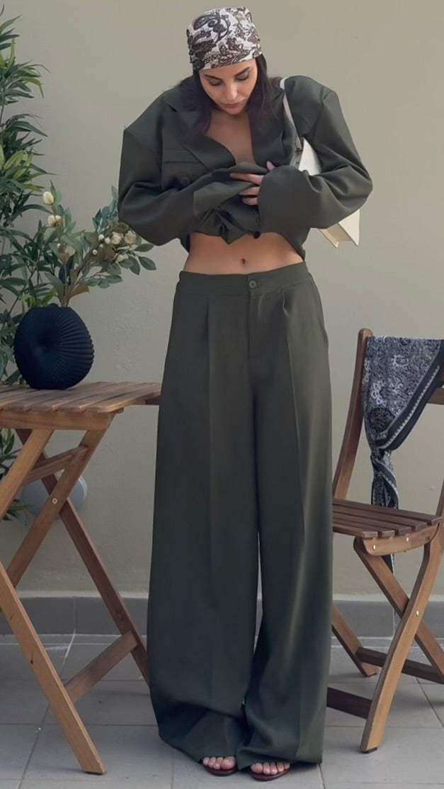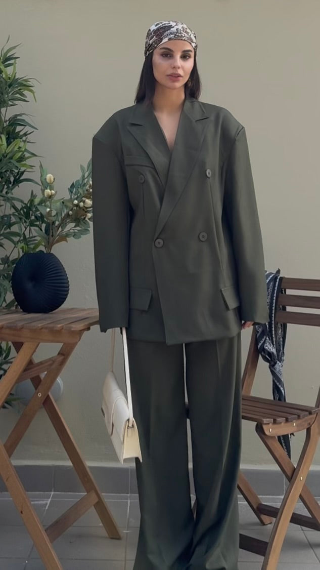 comprende giacca + pantalone; giacca molto oversize con spalline ; pantalone elasticizzato in vita