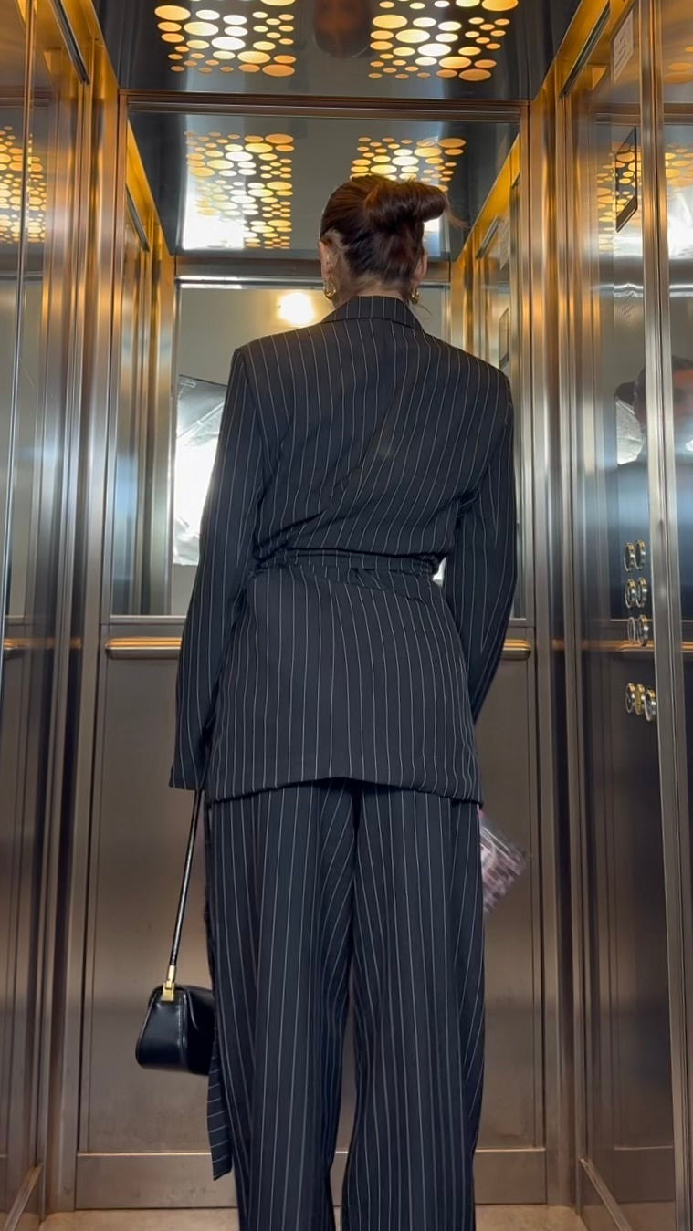 Tailleur due pezzi composto da giacca e pantalone coordinato. Giacca con revers classico, chiusura incrociata .Pantalone a vita alta con gamba ampia e dritta. Motivo gessato verticale all-over.