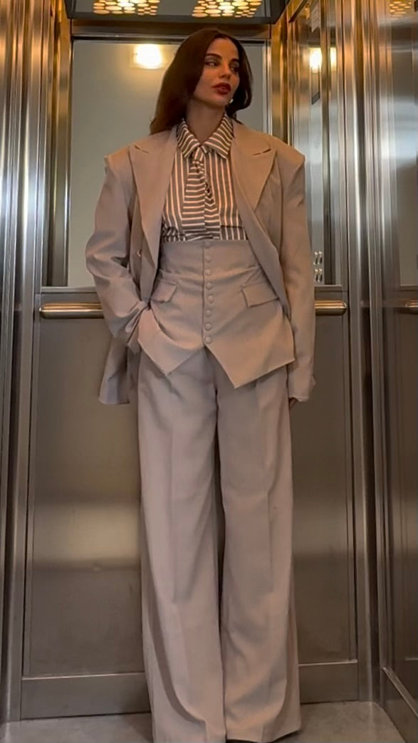 SOLO PAGAMENTO ANTICIPATO ⚠️VERRA SPEDITO CIRCA GIOVEDÌ 12 FEBBRAIO Tailleur tre pezzi composto da blazer oversize strutturato, panciotto con bottoni rivestiti e pantalone con vita elasticizzata. Linea fluida e silhouette elegante, con dettaglio elastico sul retro del pantalone che garantisce comfort e adattabilità. Pensato per look sofisticati e dal carattere deciso, da indossare insieme o separatamente per creare infinite combinazioni.