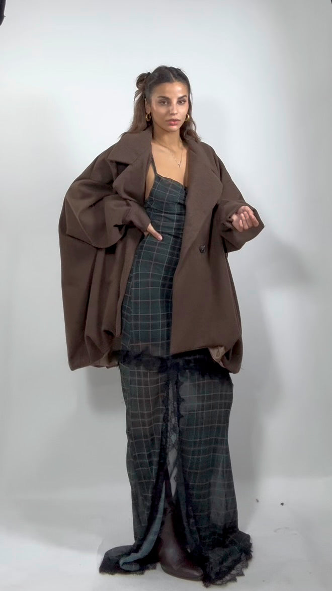 Abito lungo in tessuto leggero a fantasia check con bretelline sottili e schiena scoperta con incrocio regolabile. Il taglio asimmetrico e gli inserti in pizzo applicati lungo l’orlo donano un tocco romantico e sensuale. La silhouette segue delicatamente le linee del corpo, creando un effetto elegante e femminile, perfetto per ogni stagione.