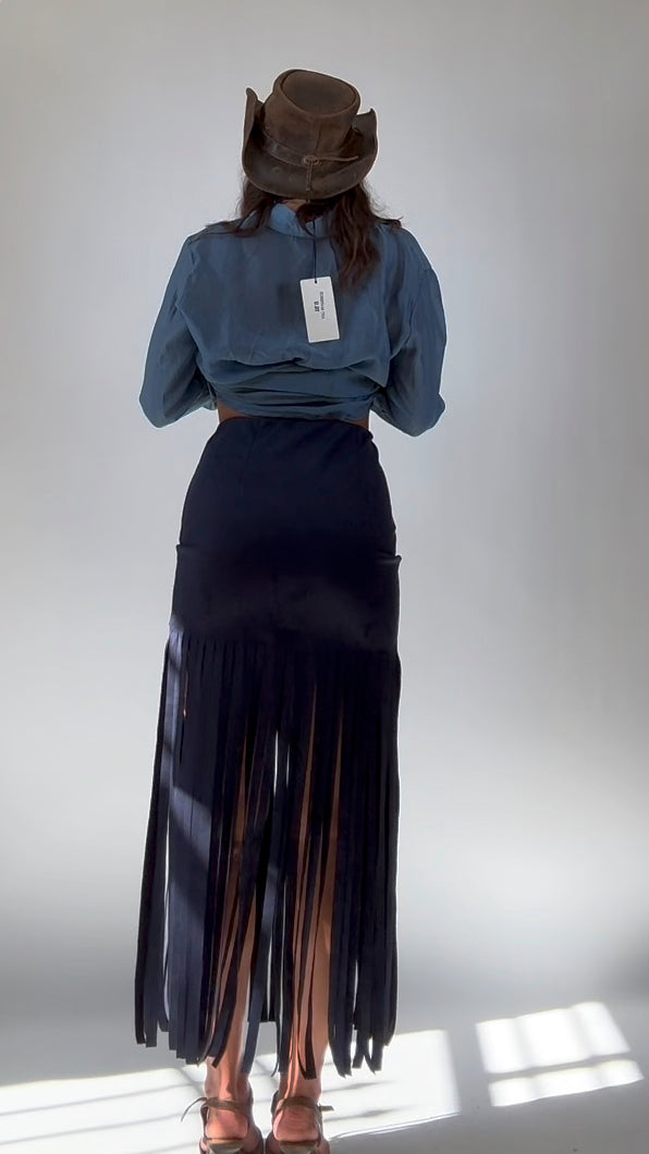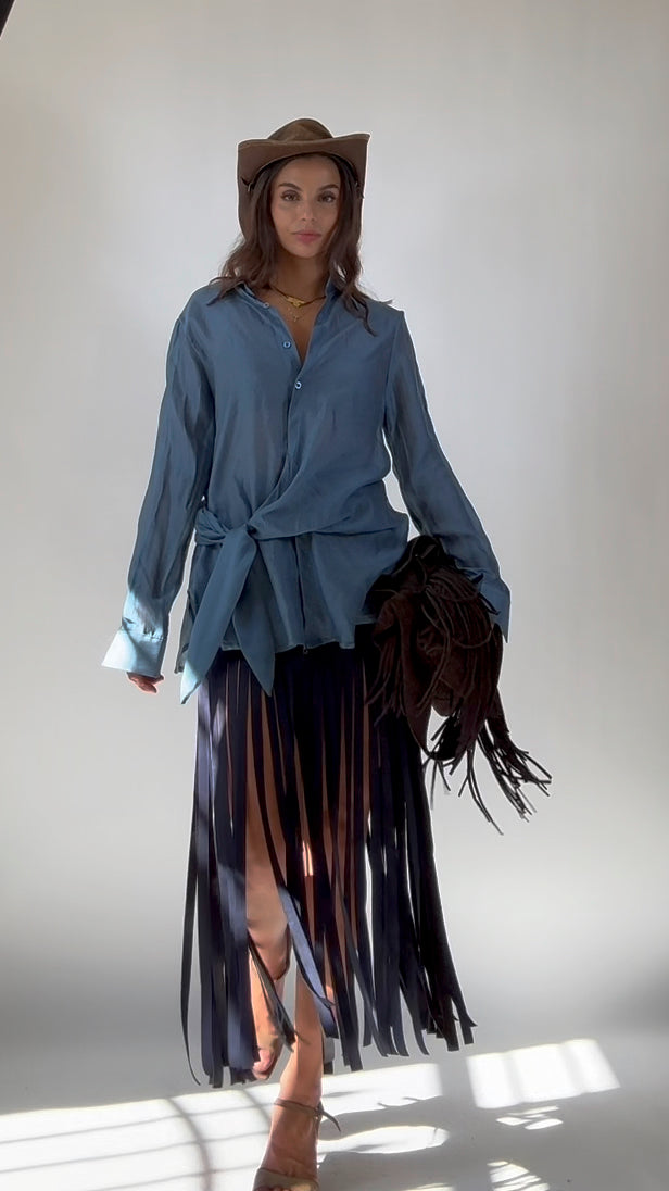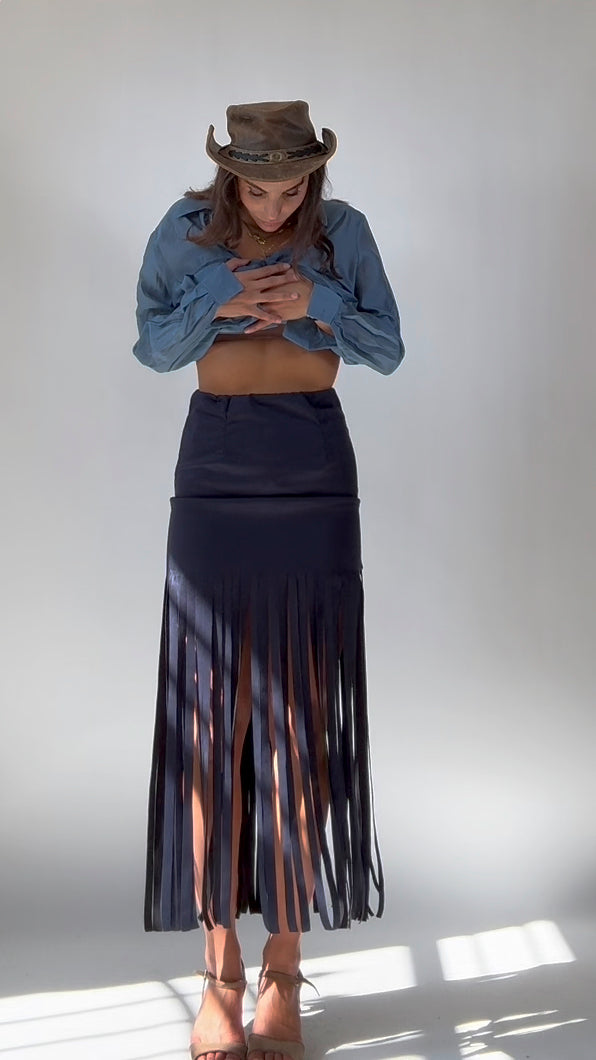 Gonna corta con maxi frange, caratterizzata da vita alta e taglio aderente sul fianco ed elastica . Le lunghe frange creano movimento ad ogni passo, donando dinamismo e un tocco scenografico al look.