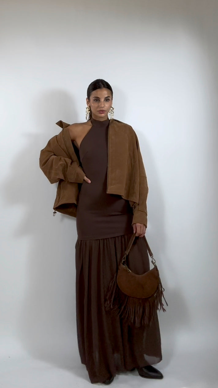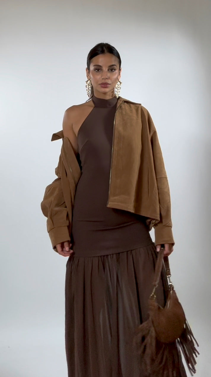Giubbotto effetto suede con zip centrale e colletto classico. Linea morbida e leggermente over, con maniche ampie e polsini strutturati. Un capo essenziale ma dal carattere deciso, ideale per completare look casual e sofisticati con un tocco urban chic.