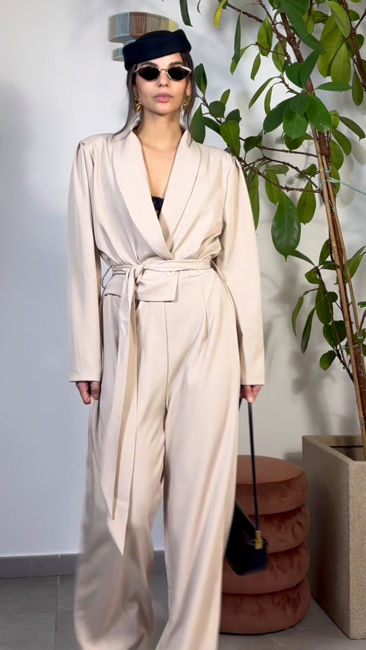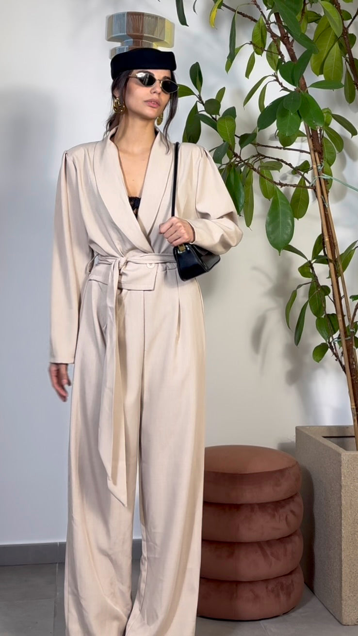 Tuta intera con struttura ispirata al tailleur. Modello con scollo a rever e chiusura frontale con bottone. Punto vita definito da fusciacca regolabile da annodare e vita elasticizzata sul retro