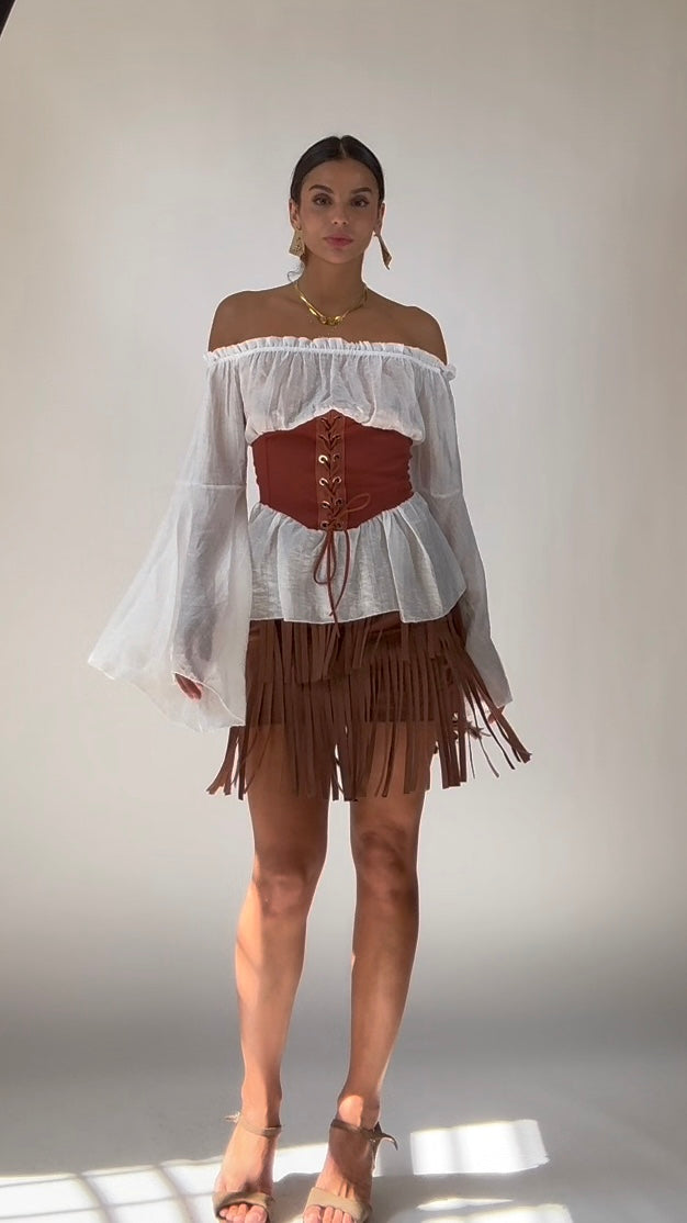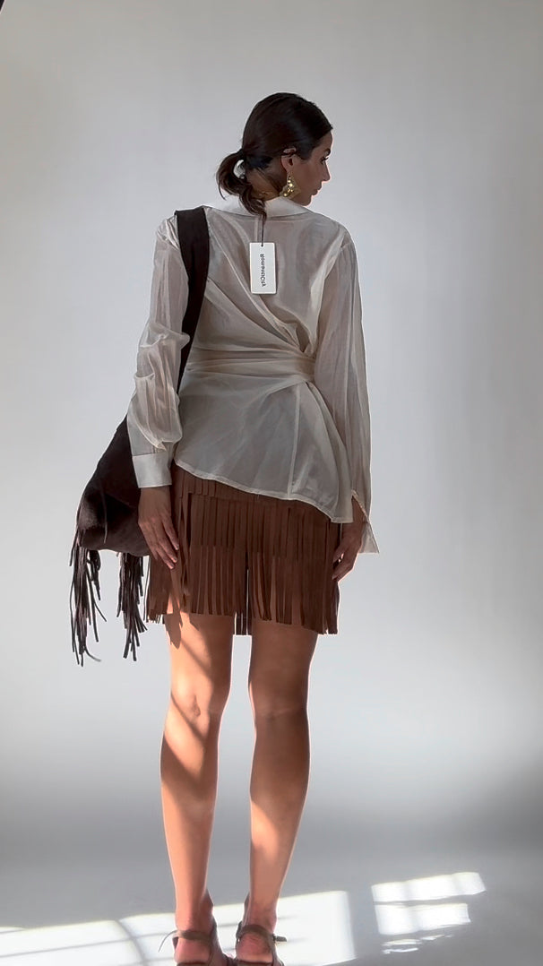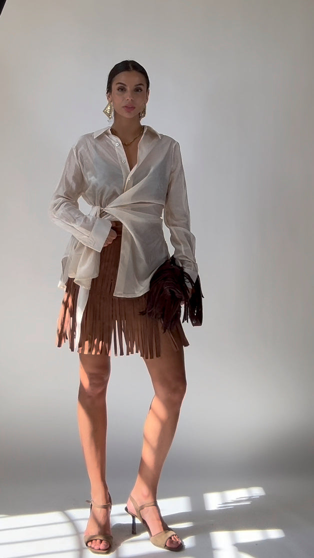 Minigonna dal taglio dritto con lavorazione a frange applicate a più livelli, che creano movimento e dinamismo a ogni passo. Vita regolare e chiusura posteriore invisibile per una linea pulita e femminile.