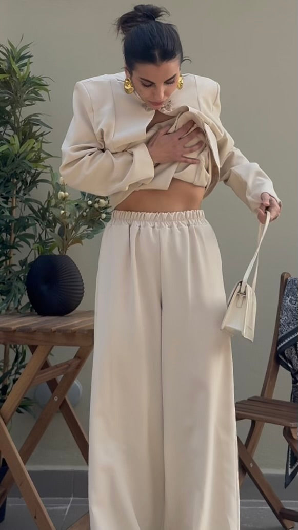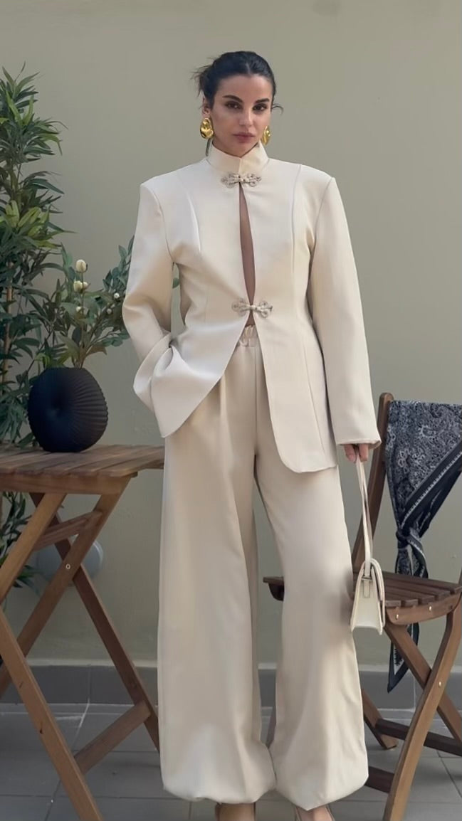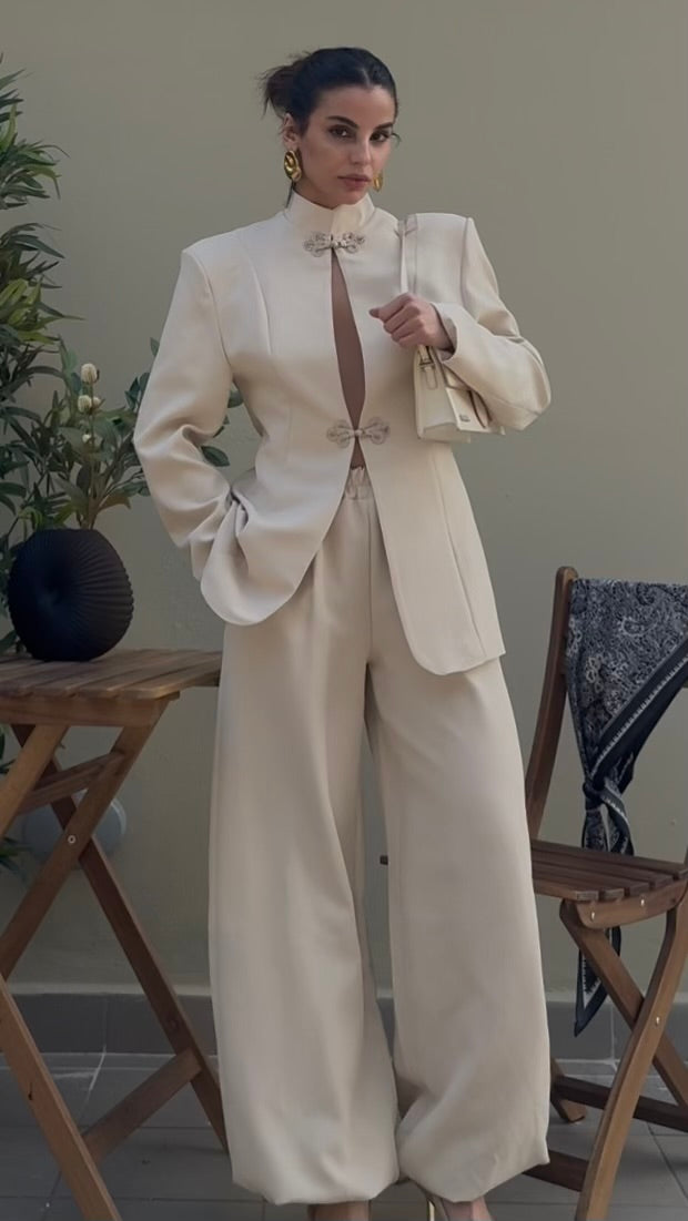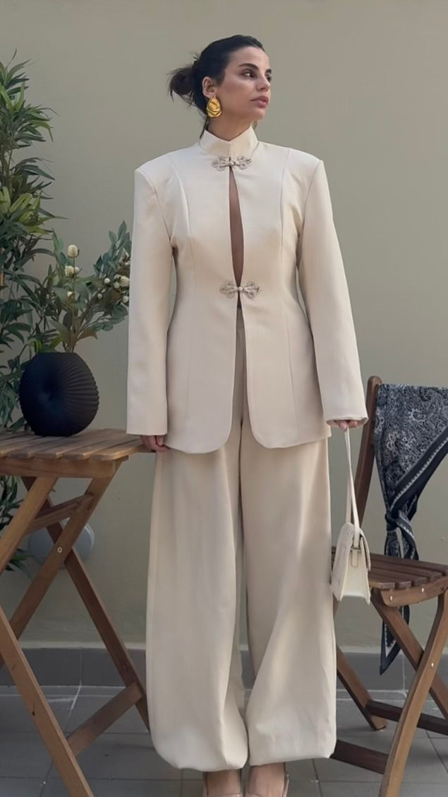 giacca strutturata con spalle definite, colletto alto e chiusura frontale con alamari, caratterizzato da apertura centrale verticale. Pantalone elasticizzato in vita all’orlo