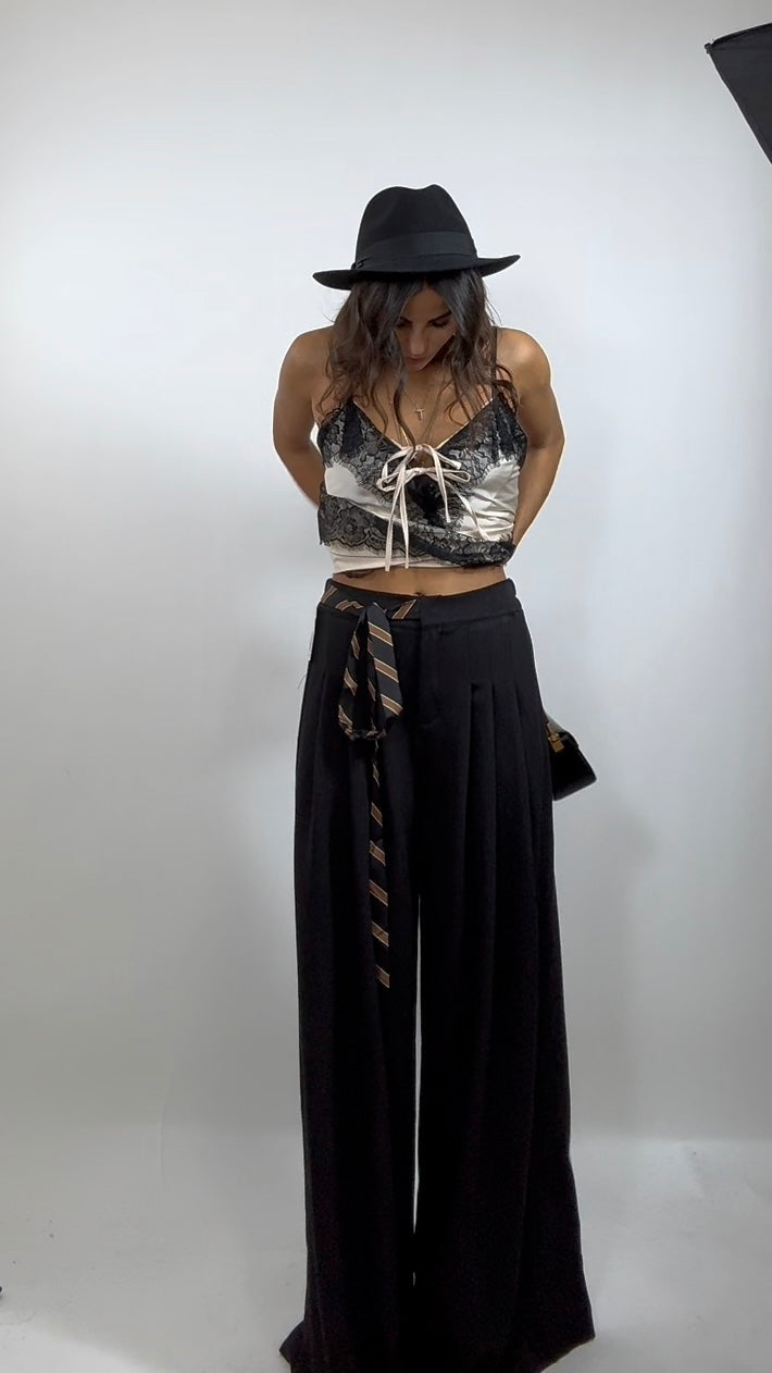 Pantalone ampio a vita bassa con pinces frontali e fascia decorativa effetto cravatta sul davanti. Il taglio lungo e fluido slancia la figura, mentre l’elastico sul retro garantisce una vestibilità confortevole e adattabile. Chiusura con zip e bottone sul davanti.