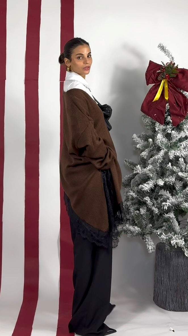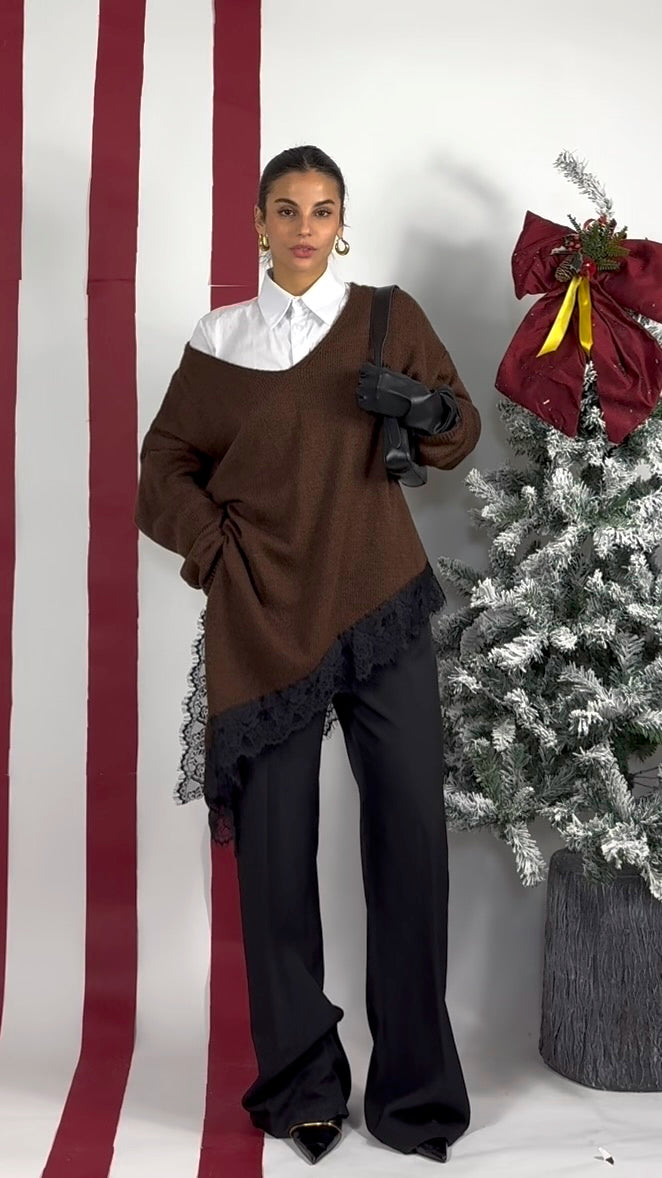 Pull morbido ed over con scollo a V e merletto all’orlo. Orlo asimmetrico con spacco laterale
