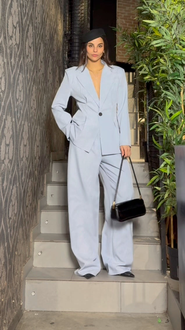 Tailleur composto da giacca monopetto con chiusura a bottone, rever classico e tasche laterali, abbinata a pantalone a vita alta con gamba ampia e linea dritta.