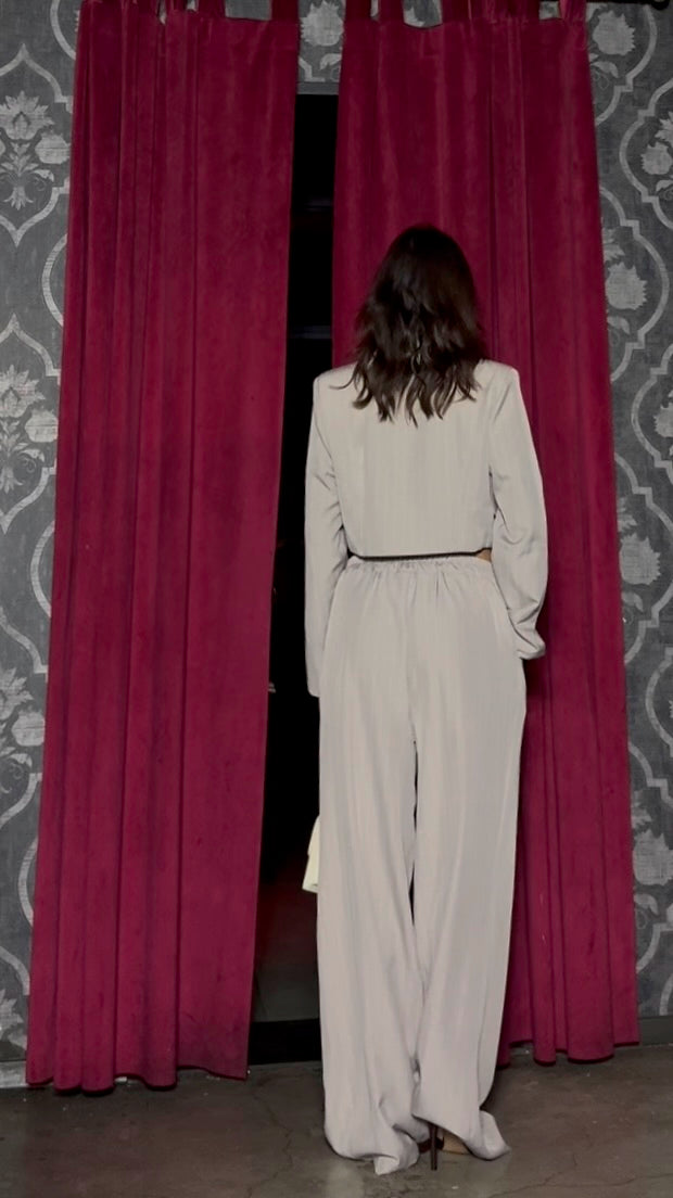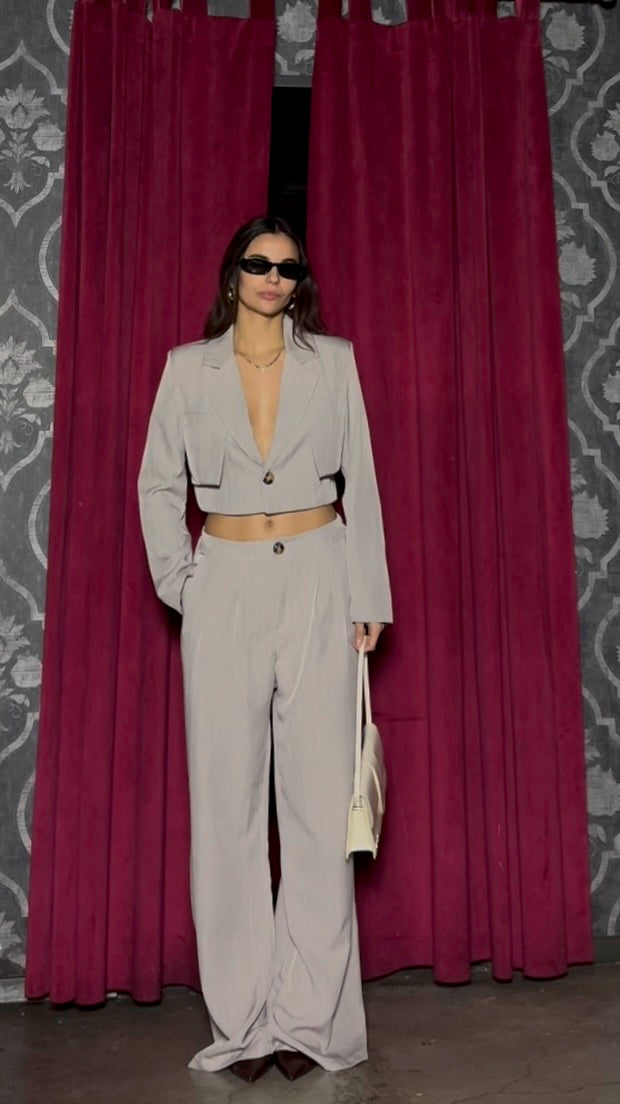 Tailleur due pezzi composto da giacca corta strutturata con revers classico, chiusura frontale con bottone e spalle definite. Linea aderente sul busto con lunghezza crop. Pantalone coordinato a vita alta con gamba dritta e chiusura frontale. Vestibilità pulita e proporzioni bilanciate tra parte superiore e inferiore.