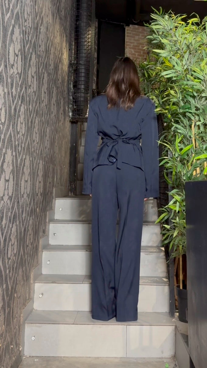 Tailleur composto da giacca con chiusura incrociata e bottoni decorativi frontali, rever classico e linea sagomata in vita, abbinata a pantalone a vita alta con gamba dritta.