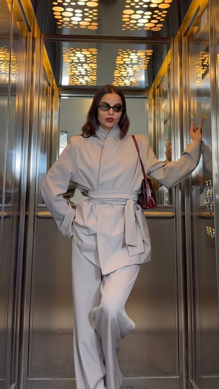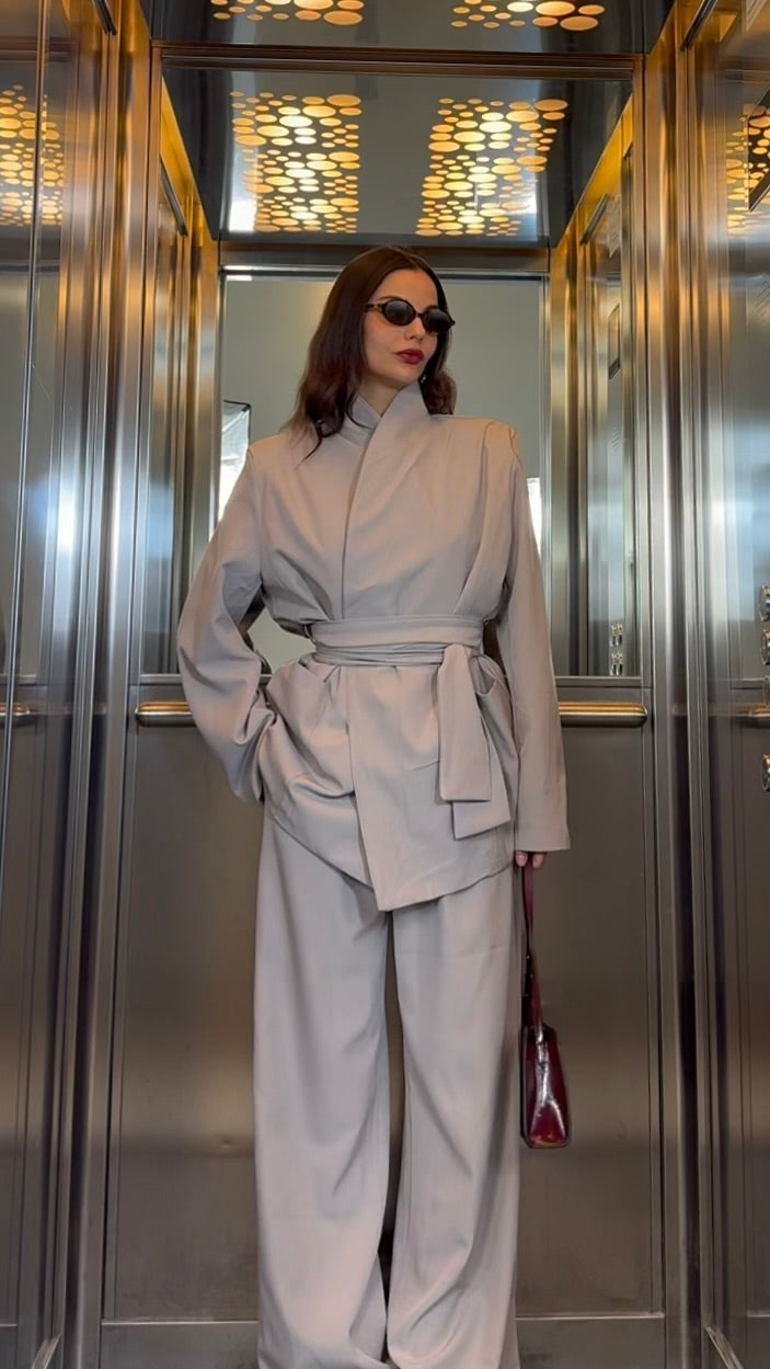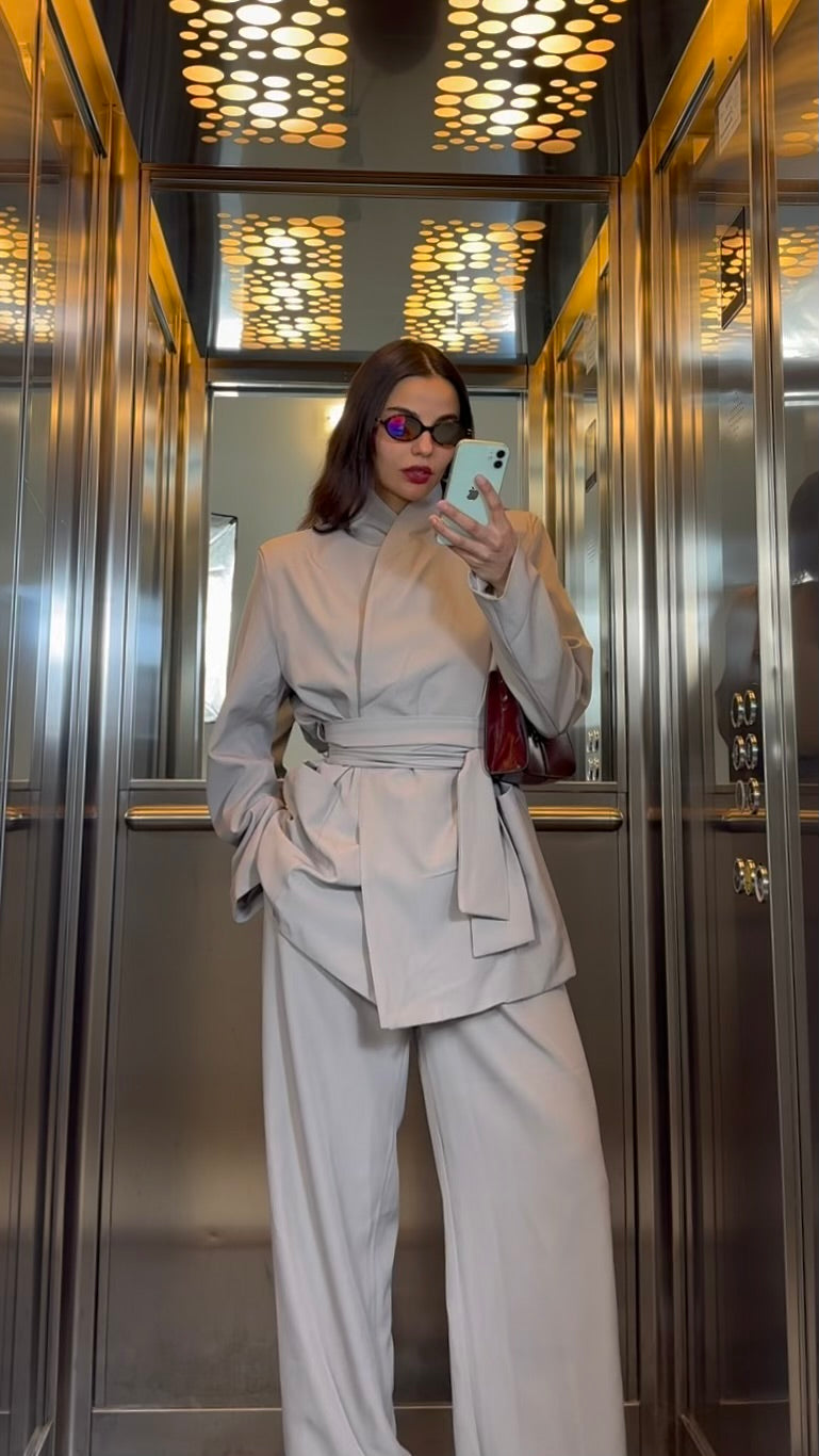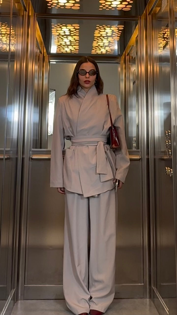 Tailleur composto da giacca con fusciacca e pantalone coordinato con elastico sul retro