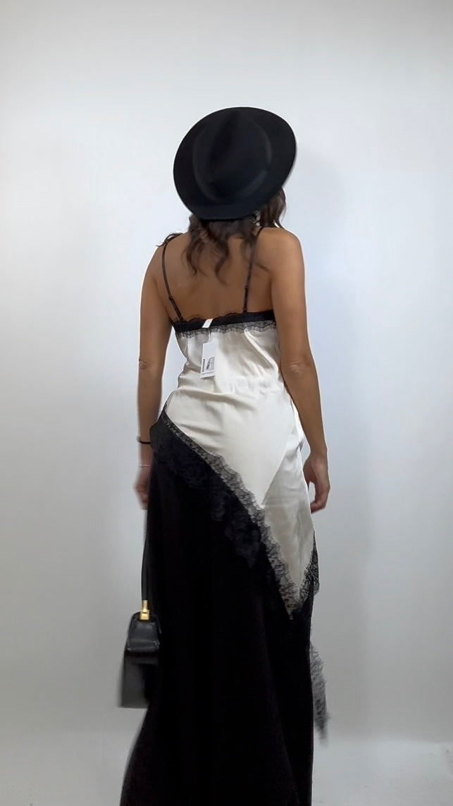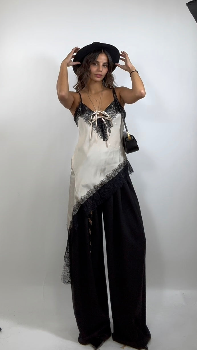 Top in stile lingerie con scollo a V impreziosito da pizzo e dettaglio frontale con fiocco sottile. Realizzato in tessuto effetto satin, presenta un taglio asimmetrico con bordo in pizzo che scende lateralmente donando movimento e sensualità. Spalline sottili regolabili per una vestibilità confortevole e femminile.