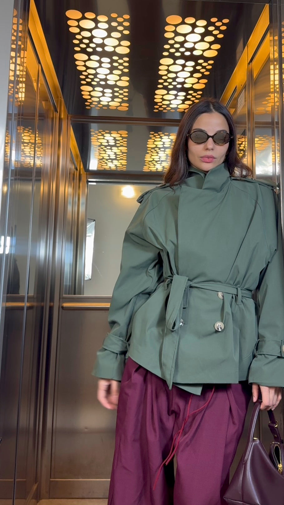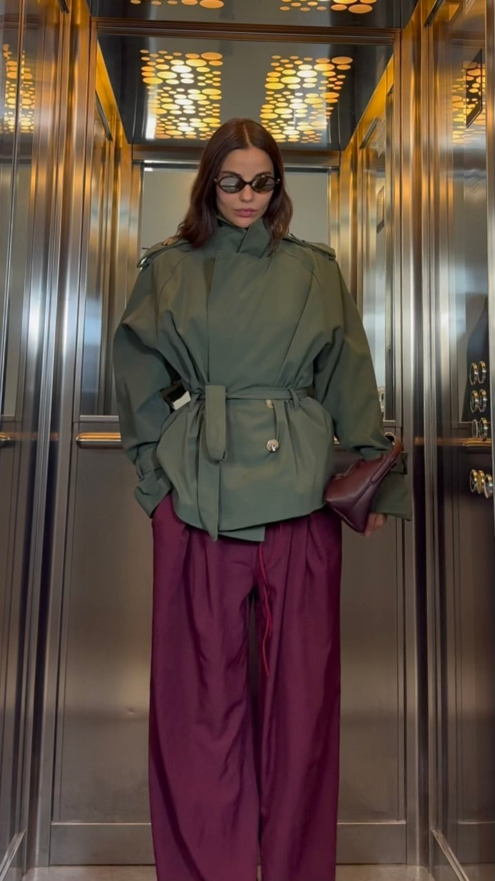 Trench corto, maniche lunghe e cintura regolabile in vita. Chiusura frontale con bottoni e linea morbida.